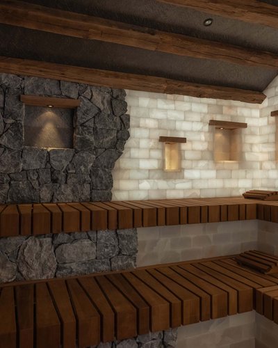 Innenraum einer Sauna mit Holzbänken und beleuchteten Steinwänden