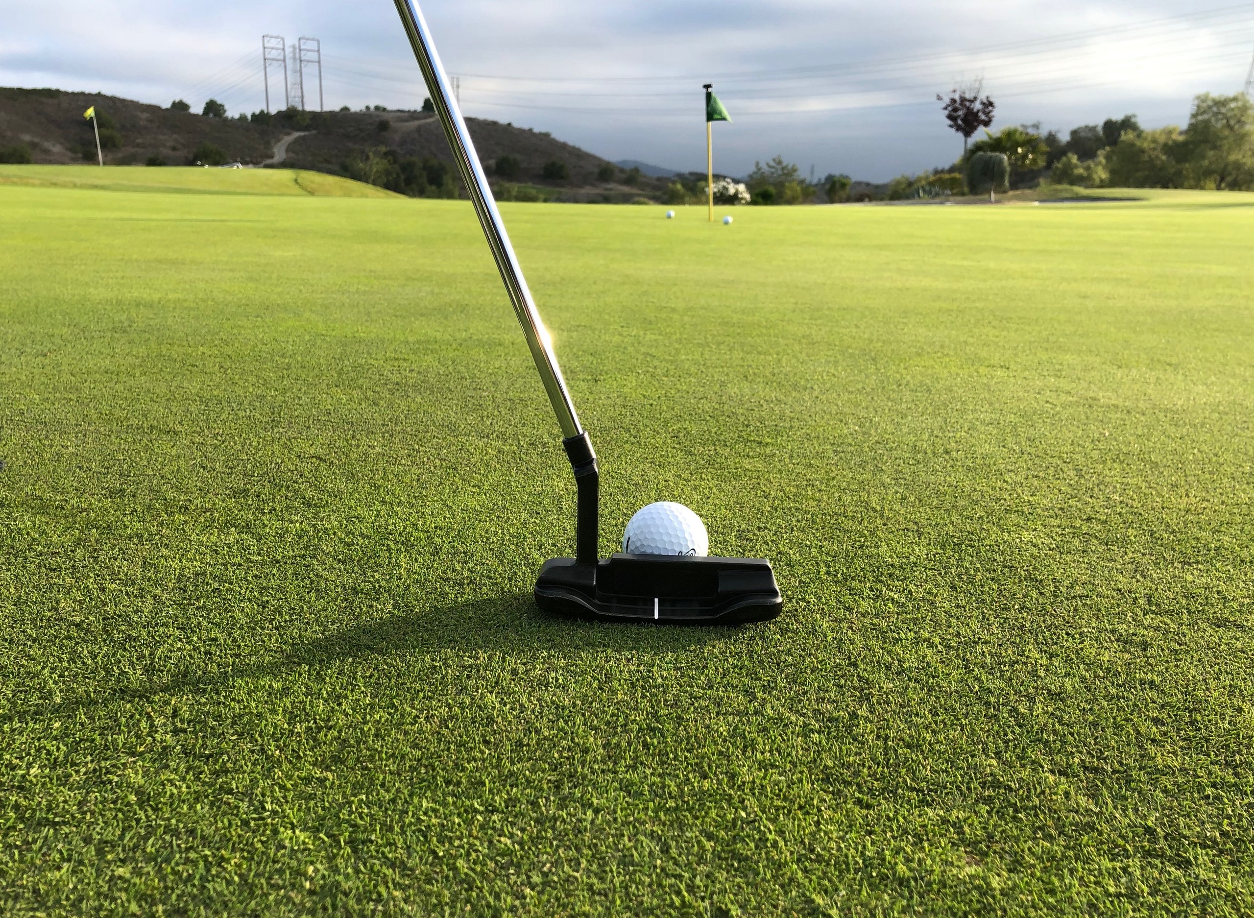 Golfball auf Grün mit Putter und Fahne im Hintergrund