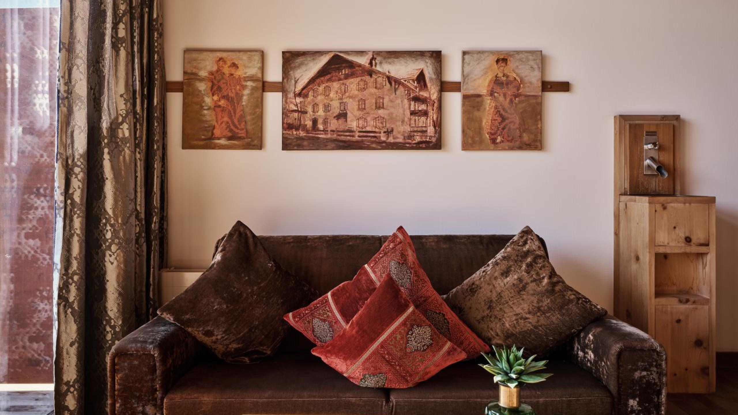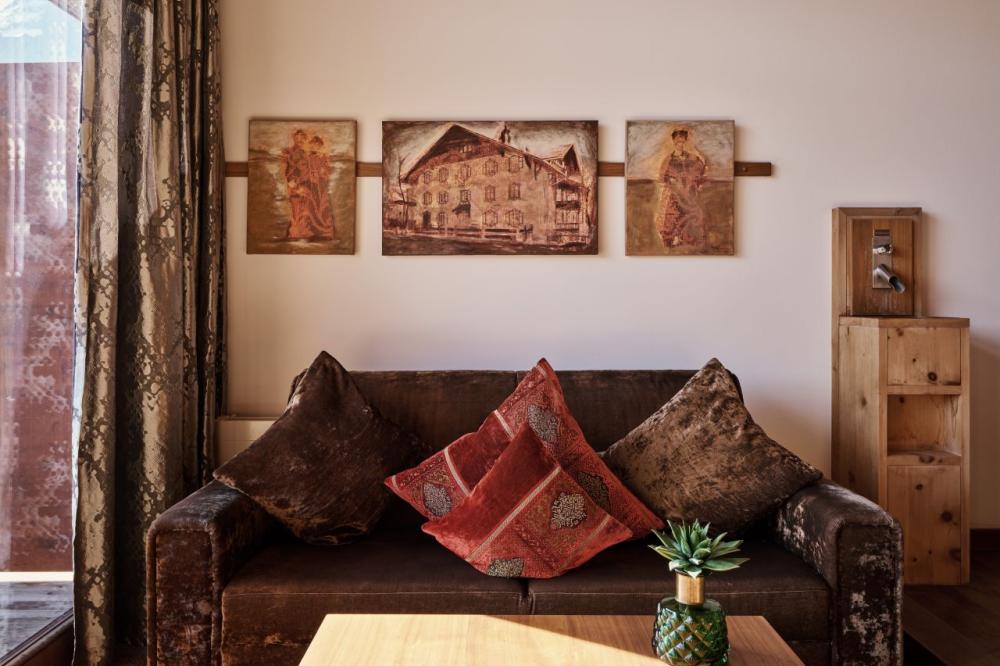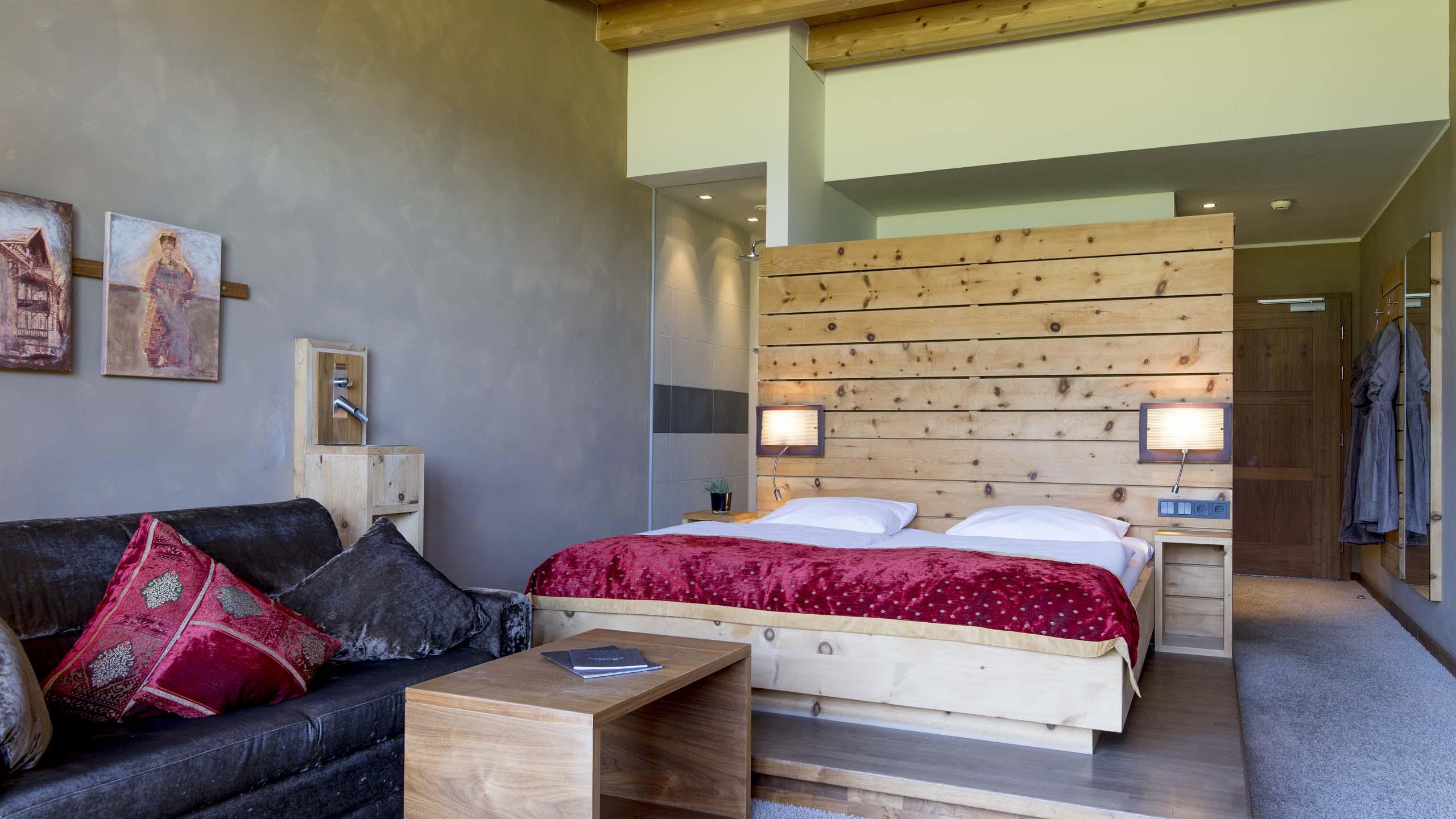 Das Zirbenholz, der Blick auf die Tiroler Berge und das gemütliche und doch luxuriöse Interieur unterstreichen den Wohlfühlcharakter dieses großzügigen Zimmers.