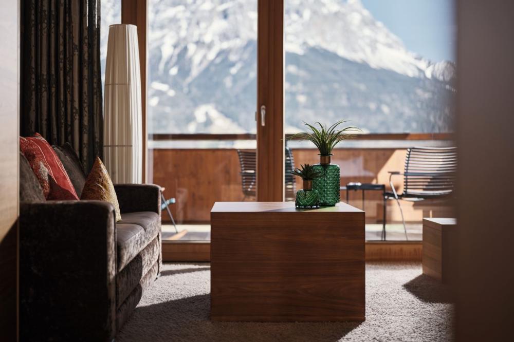 Doppelbett | Dusche und Badewanne | separates WC | gemütlicher Wohnbereich mit Sofa | Schreibtisch | Trinkbrunnen | Teppichboden | großzügiger Balkon mit Liegestühlen | Lage: Zugspitzblick