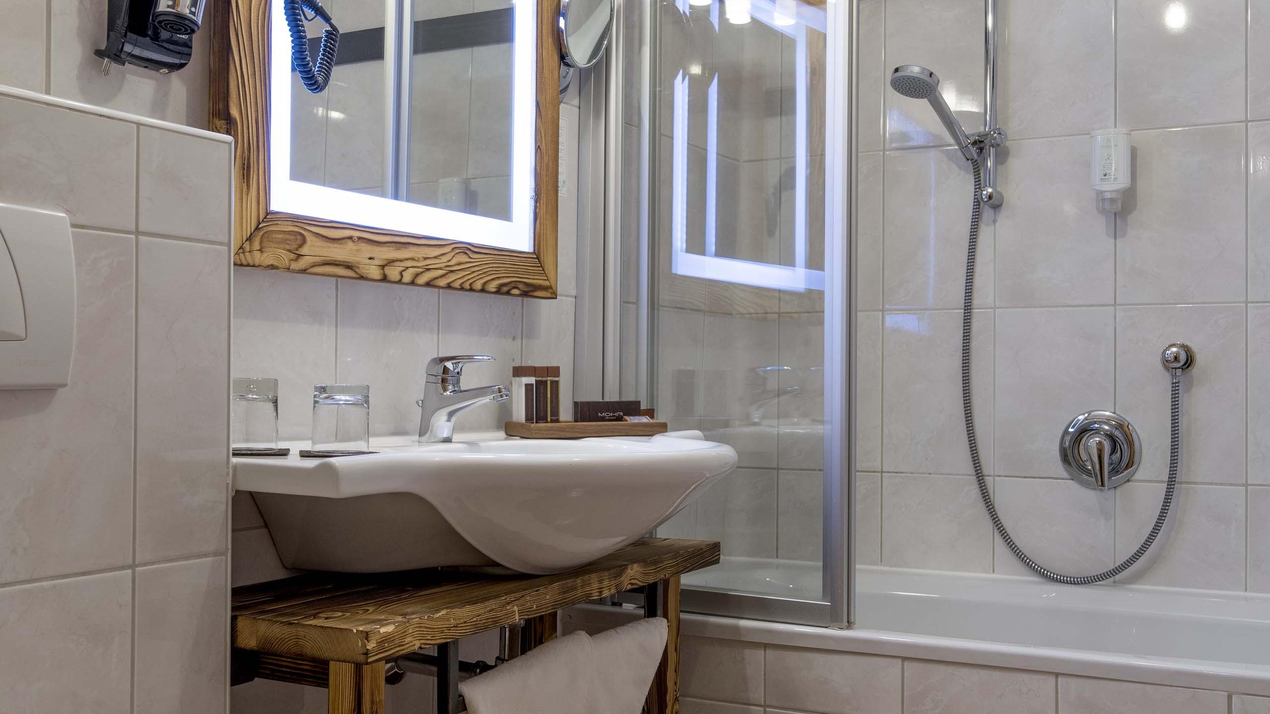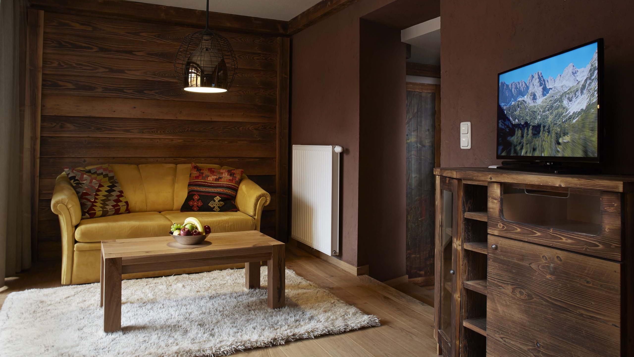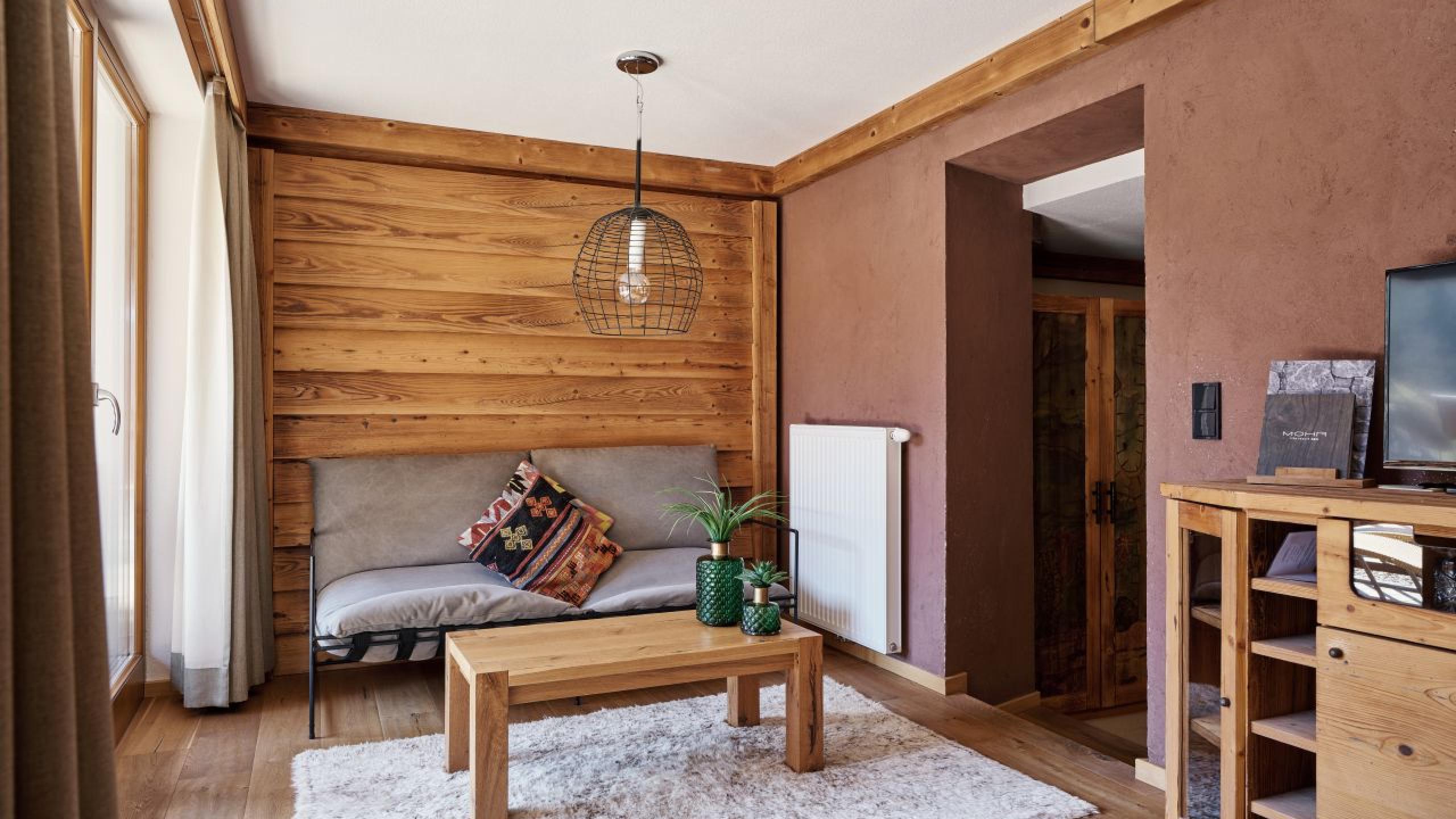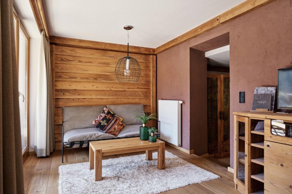 Doppelbett im Masterschlafbereich | Badewanne | Extraschlafbereich mit Stockbett für kleine Abenteurer | Wohnbereich | indirekter Bergblick | Teppichboden | Balkon | Lage: seitlich Richtung Süden